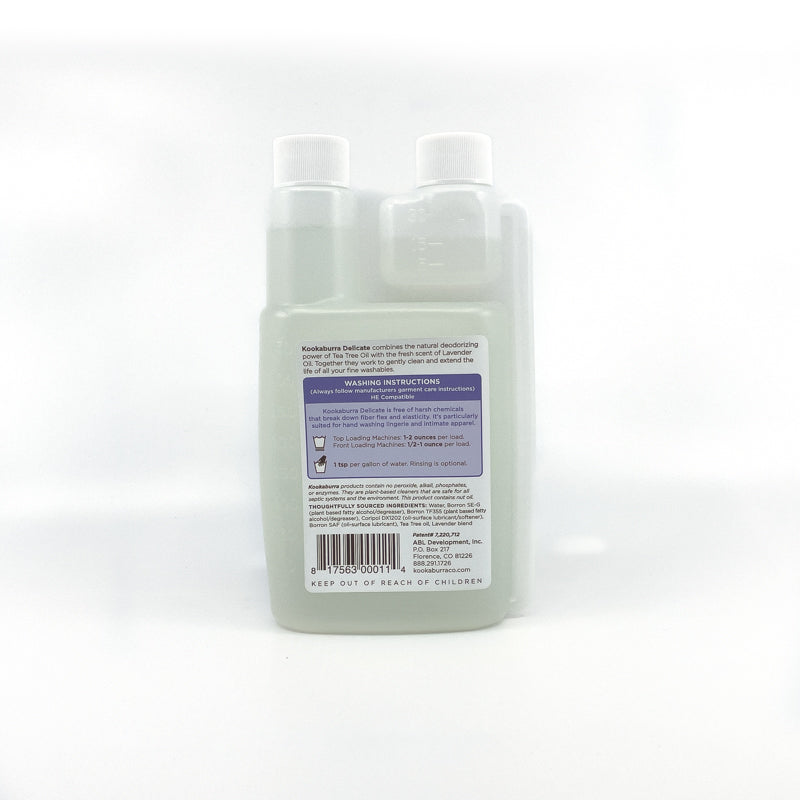 Kookaburra Delicate combines the deodorizing power of tea tree oil, the beneficial properties of lavender with the conditioning, fiber enhancing qualities of coconut and jojoba bean oils leaving your washables clean, fresh and amazingly soft. This detergent free concentrate reduces fiber breakdown, limiting fading, extending the life of your washables.