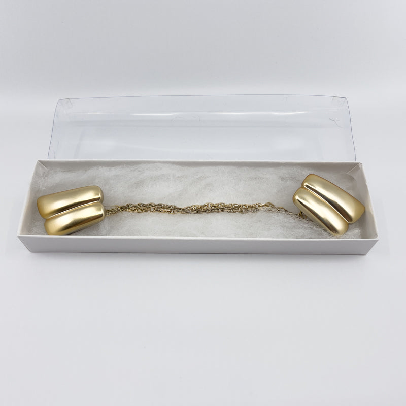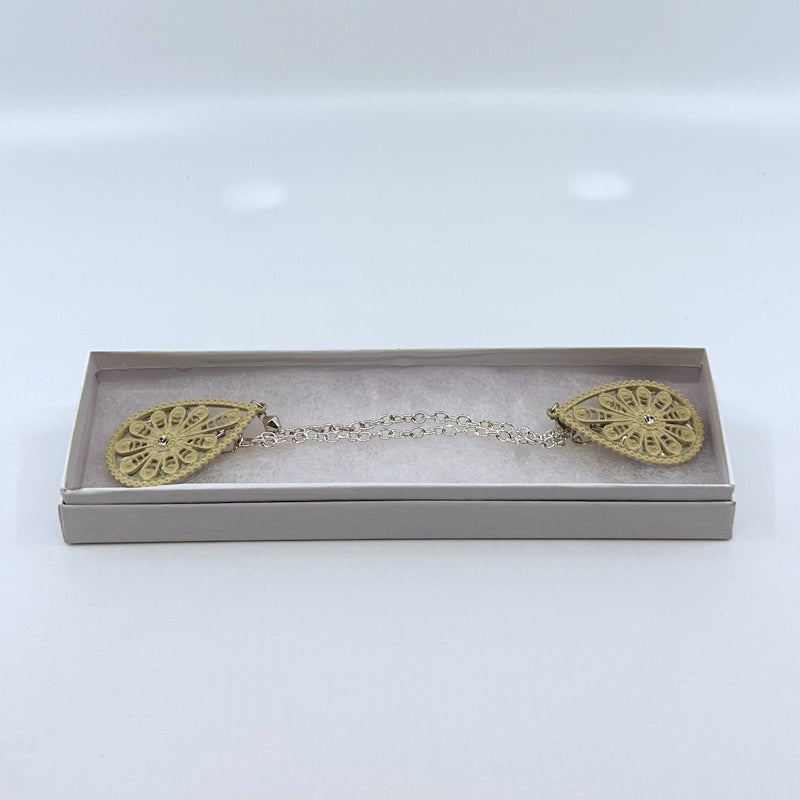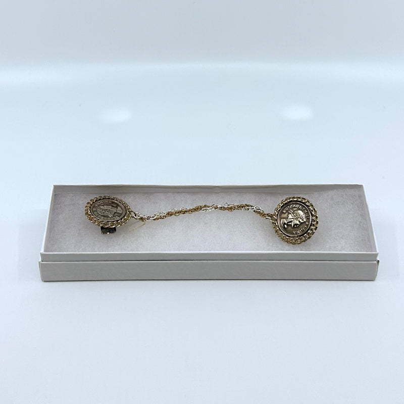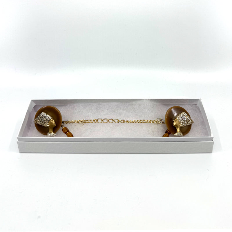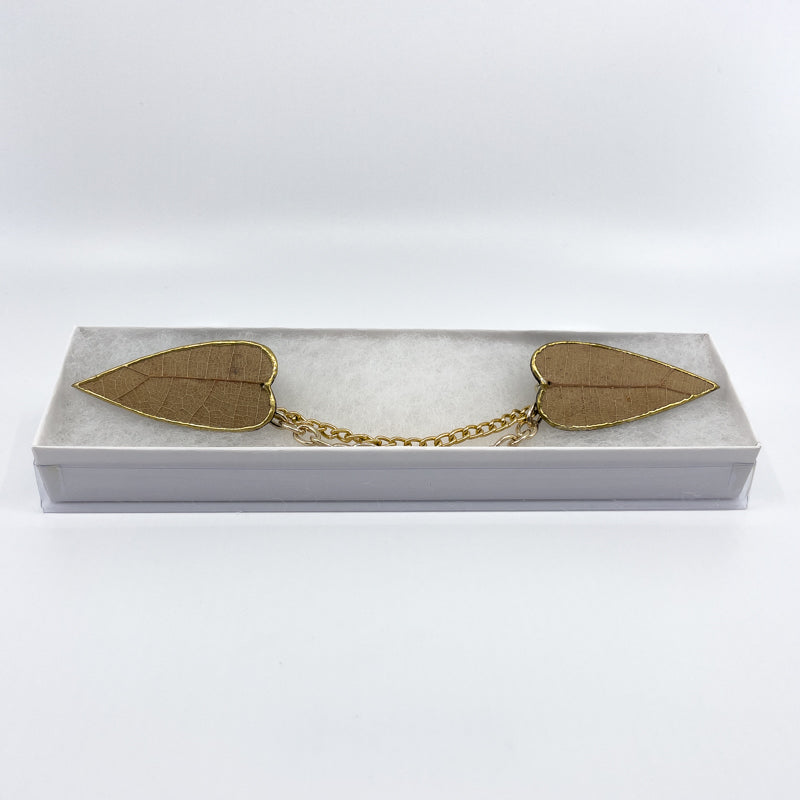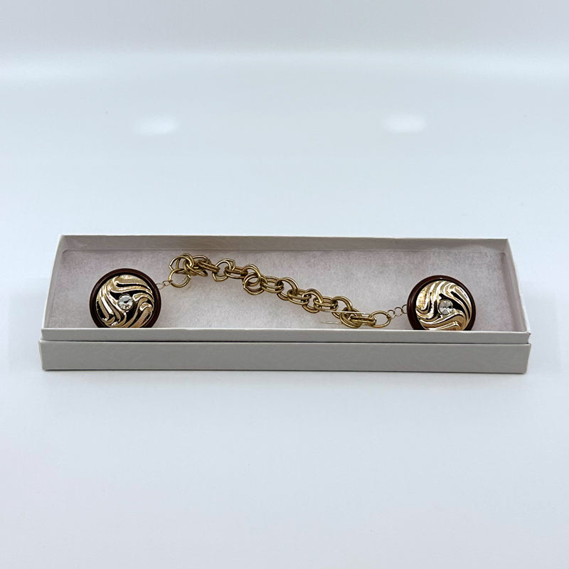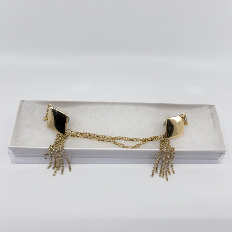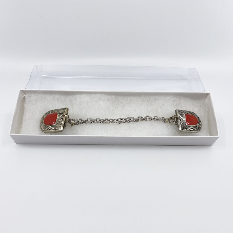 For size reference, the jewelry boxes shown are 8" in length. Sweater clips average 7” from tip to tip when pulled to the extents of their chain, but may vary due to design elements.