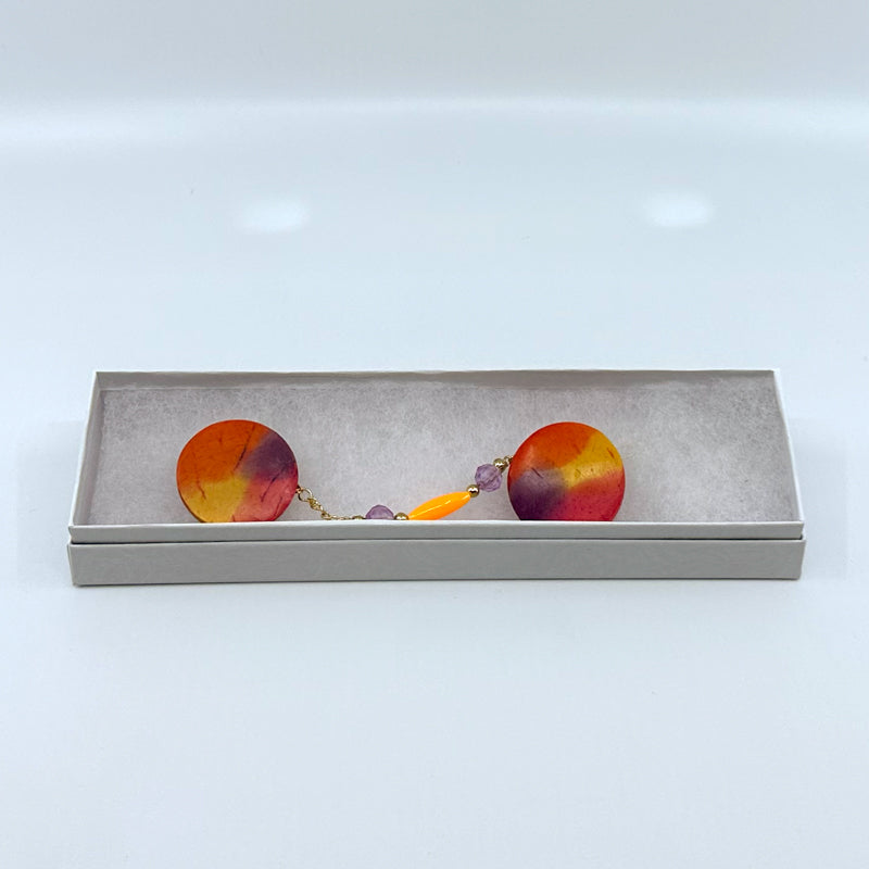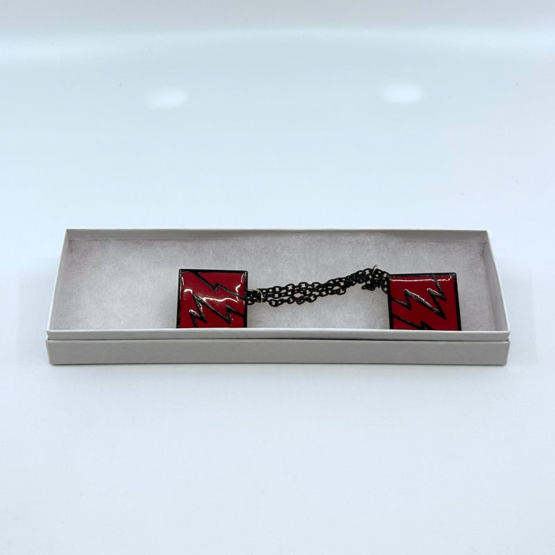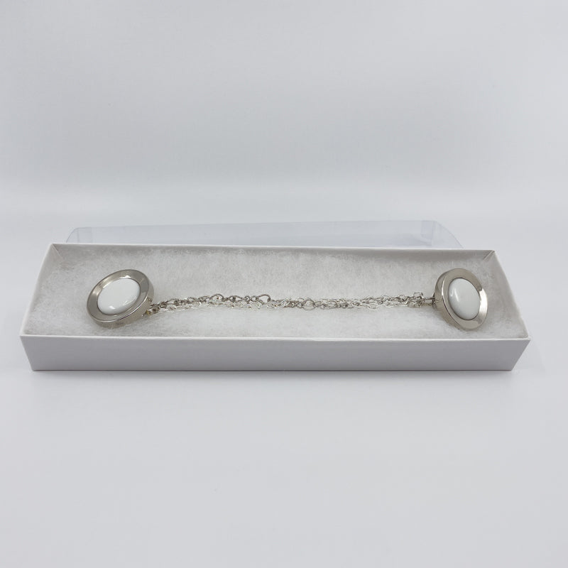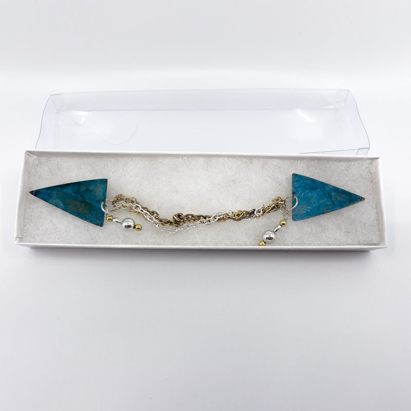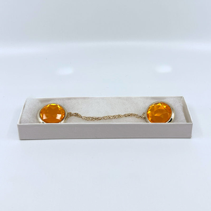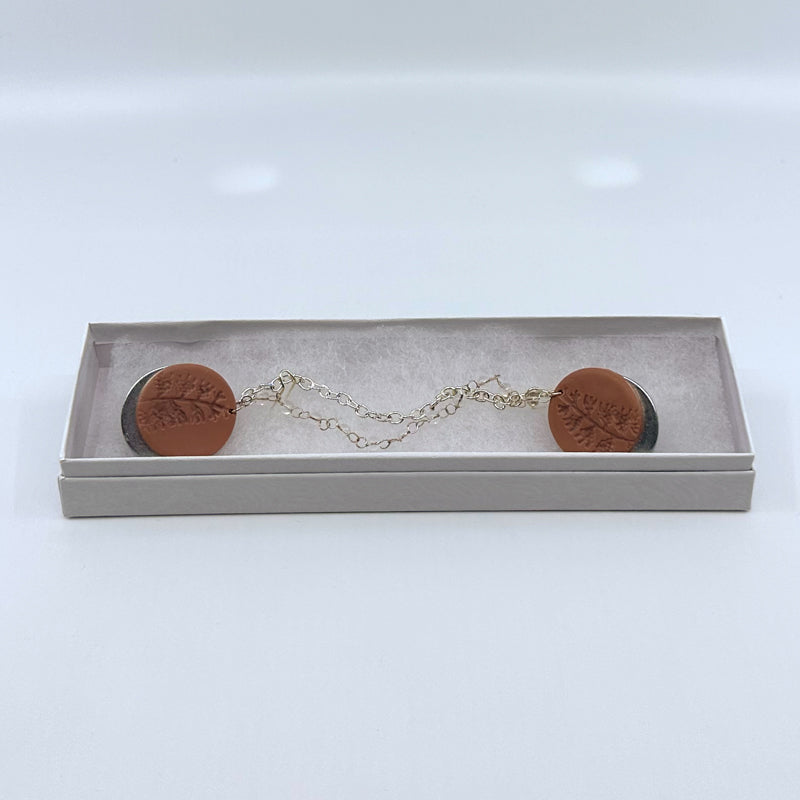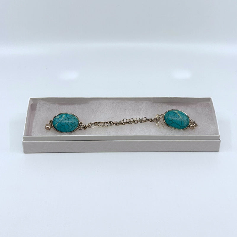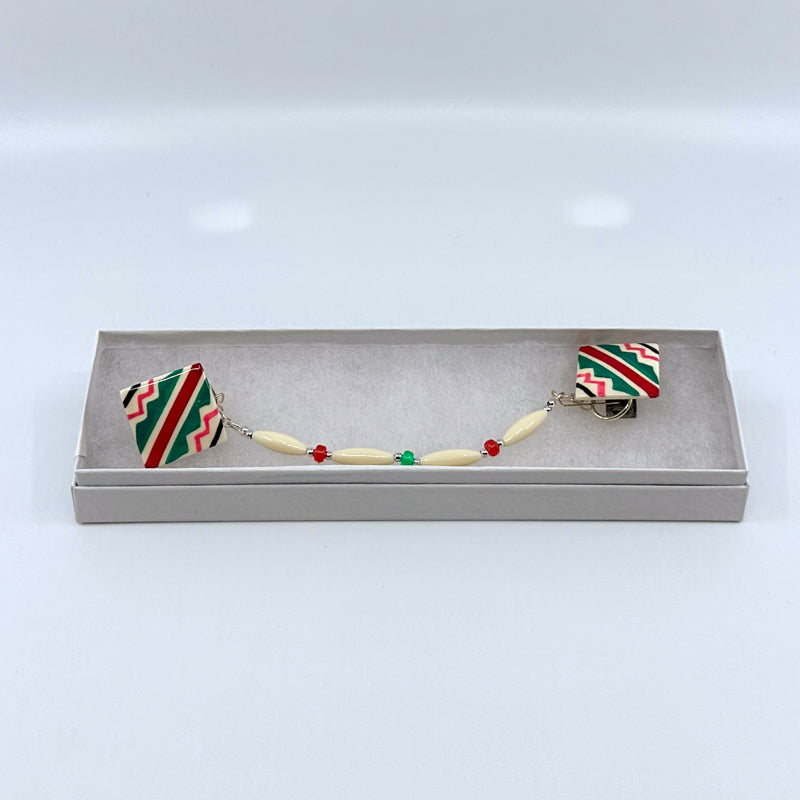 For size reference, the jewelry boxes shown are 8" in length. Sweater clips average 7” from tip to tip when pulled to the extents of their chain, but may vary due to design elements.